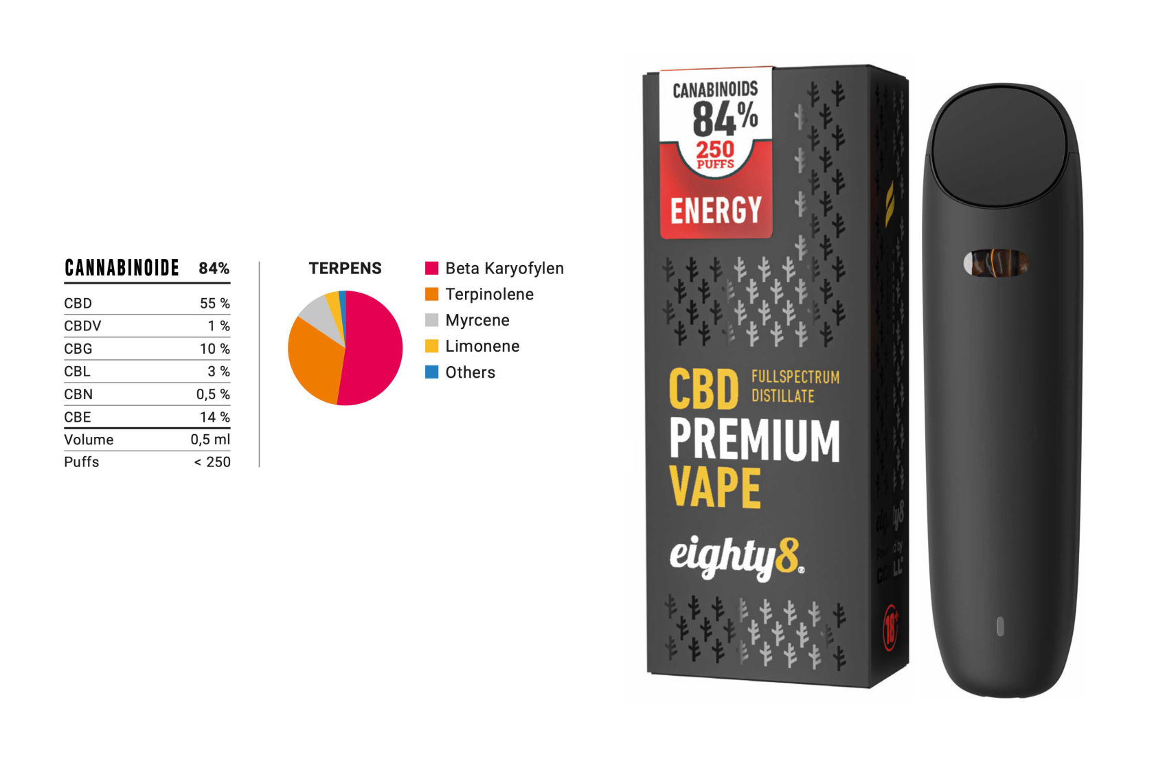 ENERGY Vaporizer Pens enthalten 84% Cannabidiole (CBD), aber worauf wir ziemlich stolz sind, ist die Zusammensetzung der einzelnen Terpene, die wir perfekt abgestimmt haben.