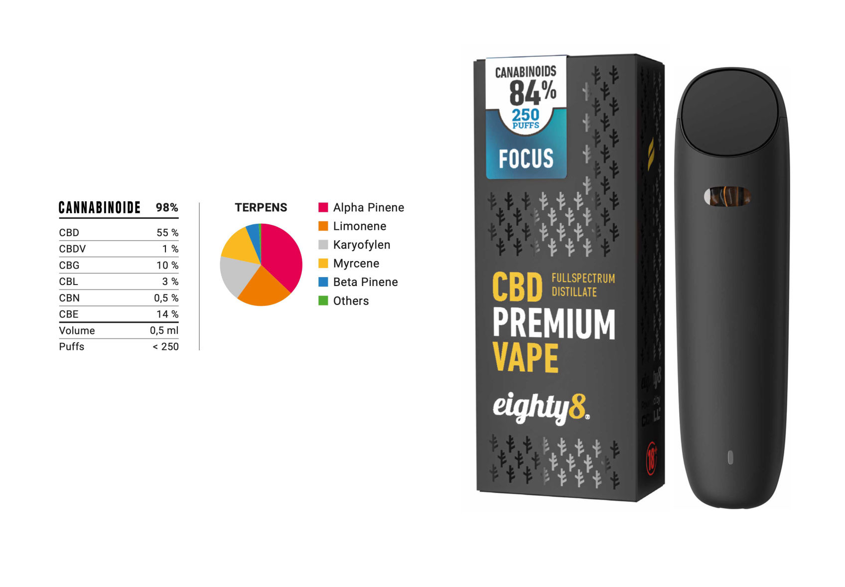 Die Zusammensetzung der Cannabinoide und Terpene im FOCUS Vaporizer Pen fördern die Konzentration und Kreativität. Im Terpenprofil sind Alpha Pinene, Limonene und Karyophylene vorherrschend.